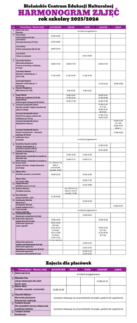 Harmonogram You may also like Konkursy • Wydarzenia VII Festiwal Piosenki im. Jonasza Kofty “Pamiętajcie o ogrodach” 13/10/2025 Wydarzenia Spektakl “Kot w butach” 12/10/2025 Ogłoszenia Do 10 października zajęcia: wesołe wokaliki, głosOFFnia, rękodzielnia marzeń, spirala kreatywności odwołane 08/10/2025
